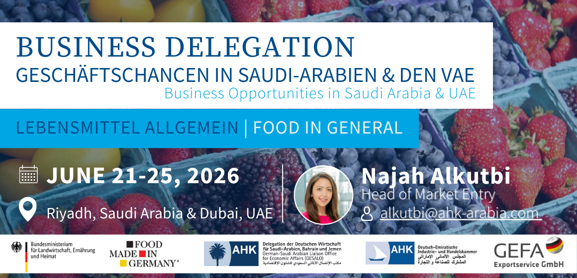 The GEFA Exportservice GmbH is organising a business trip, on behalf of the Federal Ministry of Agriculture, Food and Regional Identity (BMLEH), in cooperation with the German-Saudi Arabian Liaison Office for Economic Affairs (GESALO) in Saudi Arabia and the Chamber of Commerce Abroad United Arab Emirates (UAE) and Food â Made in Germany e. V. association, to Saudi Arabia (Riyadh) and the UAE (Dubai) on the topic of food. The aim of the business trip is to initiate business contacts, exchange experiences, and strengthen ties with local companies and experts.