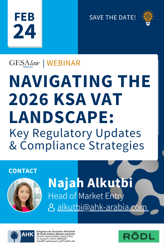 Delegation der Deutschen Wirtschaft fĂŒr Saudi-Arabien, Bahrain und Jemen (GESALO) | Dr. Dalia Samra-Rohte | Pure, Block B, 1st Floor, Takhassusi Branch Road, 7993 Al Mohammadiyyah 3213 | 12364 Riyadh | Saudi Arabia | +966-92 000 5863 | rohte@ahk-arabia.com