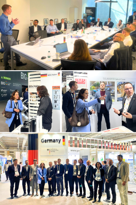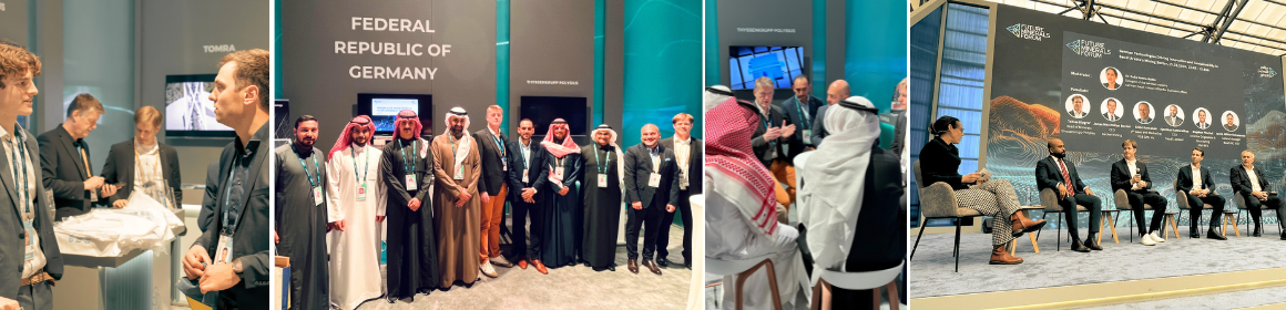 | In January, the GESALO team had the great honor of organizing the German Pavilion at the Future Minerals Forum (FMF) as part of the foreign trade fair promotion program of the Federal Ministry for Economic Affairs and Energy. The fifth Future Minerals Forum was held under the motto âDawn for a Global Causeâ. The 10 German companies participating in the pavilion presented their innovations and technologies âMade in Germanyâ to contribute to a sustainable and future-proof mining sector. The event was rounded off by a get-together at the stand with H.E. Michael Kindsgrab, Ambassador of the Federal Republic of Germany to Saudi Arabia and our Delegate for the German Industry in Saudi Arabia, Dr. Dalia Samra-Rohte. |